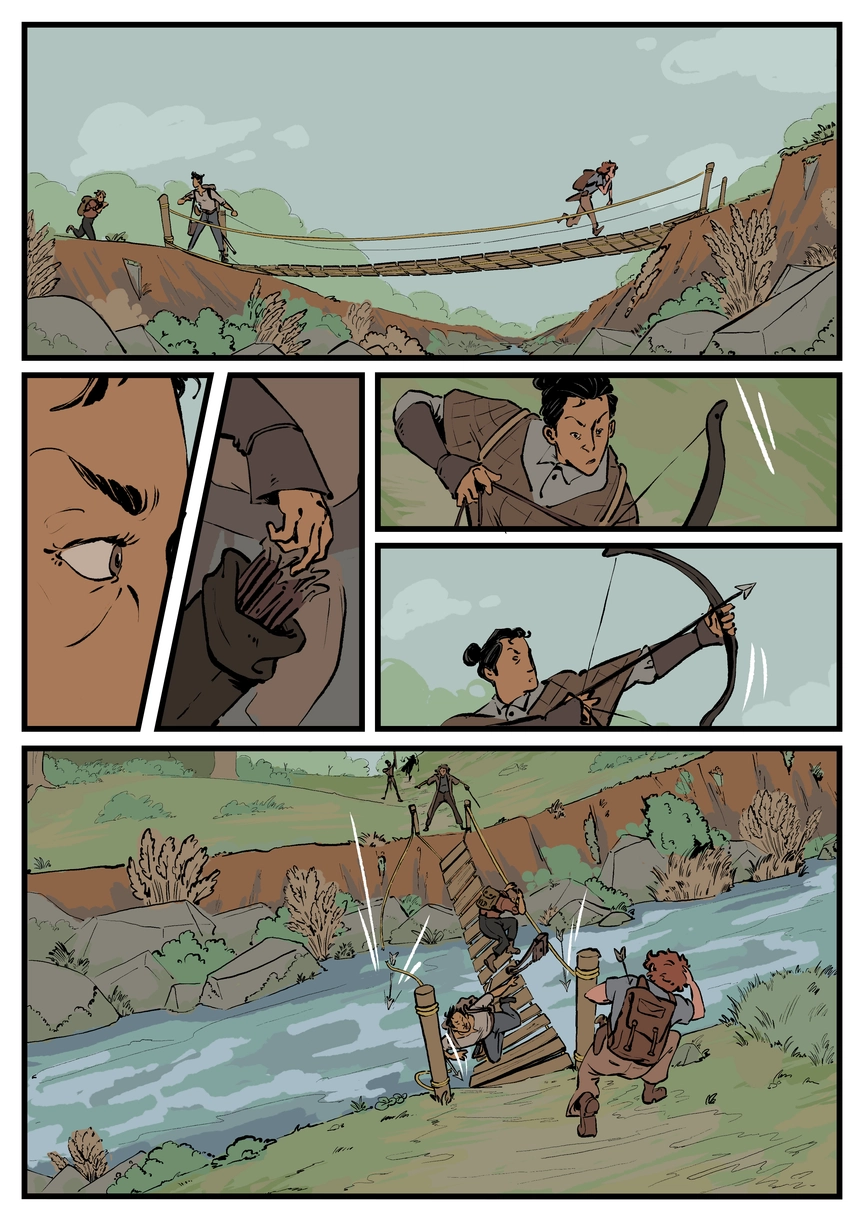 PANEL 6: Even though she is relatively far from the bridge, the boss ends up ejecting three arrows in a row. Two of them hit one of the bridge ropes, cutting it and destabilizing the structure. Alan and Hector are still running on the bridge; Hector manages to pounce on the undamaged rope to avoid falling, while Alan, who was already about to reach land, begins to fall to the side, losing his backpack in the fall. Fran, who is already on the other side, observes the situation with alarm. She is squatting down and covers her head because of the arrow shots. The Eleans are stuck on the opposite side. The man reaches the beginning of the bridge and stops, noticing the fast-flowing, cobbled river, while the others come running behind.