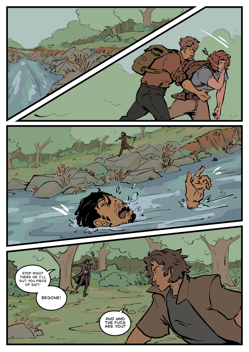 PANEL 4: On that same side of the river bank, a man in a hat, pants and shirt, with a dark overcoat on top, comes running from the forest. He is waving an axe in his hand, shouting: "Stop there or I'll gut you, piece of shit! Begone!", to which the man with the sword responds without batting an eyelid: "And who the fuck are you?".
