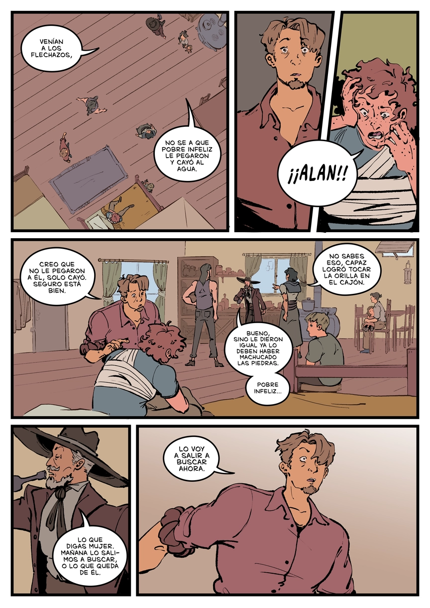 PANEL 1: El hombre continúa contando, parado en el mismo lugar: “Venían a los flechazos, no sé a qué pobre infeliz le pegaron y cayó al agua”.