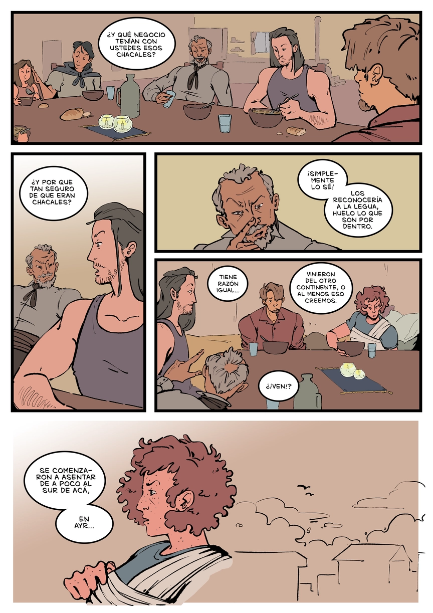 PANEL 1: En la mesa hay un par de humildes hogazas de pan repartidas en trozos para cada comensal, un botellón de agua y vasos de vidrio para cada uno. Las velas del centro siguen resplandeciendo. La mujer acaricia apaciblemente el rostro de su hija, que come con celeridad. El hombre sigue comiendo de su cuenco. El anciano se ha quitado su ancho sombrero y está apoyado cómodamente contra el respaldo de su silla, meciendo el contenido de su vaso con la mano. Con expresión risueña le pregunta a Hector: “¿Y qué negocio tenían con ustedes esos chacales?”.